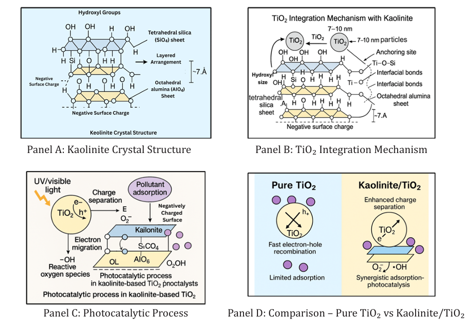 Kaolinite (Al₂Si₂O₅(OH)₄) is a naturally abundant 1:1 layered aluminosilicate clay mineral comprising alternating silica tetrahedral (SiO₄) and alumina octahedral (AlO₆) sheets that are tightly bonded by hydrogen bonds, result- ing in a stable, non-swelling structure. The surface of kaolinite is rich in hydroxyl (-OH) groups. It carries a net negative charge, which enhances its ability to adsorb cationic pollutants and supports the uniform dispersion of semiconductor nanoparticles such as TiO₂ [17,18]. These features are visually depicted in Panel A of the schemat- ic, highlighting the layered arrangement, hydroxyl groups, and negative surface charge.