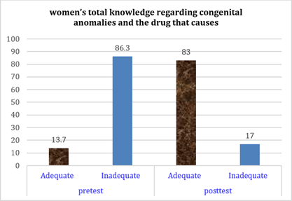 Figure (2) shows that it was noticed that 86.3% of women had an inadequate knowledge level regarding congenital anomalies and the drug that causes them during the pretest; that regressed to only 17.0% posttest.