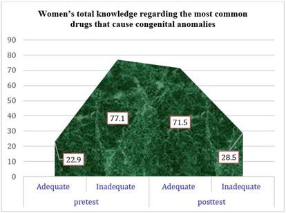 Figure (3) shows that it was noticed that 85.2% of women had an inadequate knowledge level regarding the most common drugs that cause congenital anomalies; that regressed to 21.8% posttest.