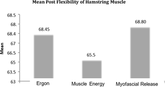 The purpose of this study was to evaluate the effectiveness of three techniques Ergon, Muscle Energy Technique (MET), and foam rolling on hamstring muscle flexibility (Figure 4). Hamstring muscle stiffness is a common condition, particularly among individuals with a sedentary lifestyle, and is typically managed through various physical therapy interventions, diagnosed primarily through physical examination. The findings of the current study demonstrated that the Ergon technique was the most effective in increasing hamstring flexibility. These results align with the study by Jong Hoon Moon et al. (2016), which investigated the effect of the Ergon Technique on hamstring flexibility and pain intensity in patients with nonspecific low back pain. Their study reported significant improvements in hamstring extensibility in the Ergon group compared to static stretching, concluding that the Ergon Technique may be a simple and effective intervention to enhance hamstring extensibility and reduce pain in clinical practice. Similarly, Fousekis K. et al. (2016) evaluated myofascial trigger points (MTrPs) management and reported that Instrument-Assisted Soft Tissue Mobilization (IASTM), ischemic pressure techniques, and cupping are effective in reducing tenderness of MTrPs. Among these, the Ergon© IASTM technique demonstrated significantly greater improvements in pain symptoms, highlighting its potential as a superior therapeutic approach. Participants in the Muscle Energy Technique group also showed significant improvement. These findings are consistent with the study by M. Prasad Naik et al. (2017), which demonstrated notable improvements in hamstring and calf muscle flexibility following MET interventions. Furthermore, Arun et al. (2018) concluded that MET is a straightforward technique that effectively increases muscle length and joint range of motion by inducing biomechanical and neurophysiological changes, as well as increasing stretch tolerance. The technique promotes relaxation of hyperactive muscles and associated connective tissue, thereby facilitating muscle elongation. In the Myofascial Release (foam roller) group, significant improvements were also observed, with mean hamstring flexibility increasing seen in the biostatistics table given in the manuscript. This finding aligns with the study by Scott W. Cheatham et al. (2015), which reported that roller massage and foam rolling are effective in enhancing joint range of motion and muscle performance pre- and post-exercise. However, due to methodological variability across studies, there remains no consensus on the optimal self-myofascial release (SMR) program. In summary, all three interventions Ergon technique, Muscle Energy Technique, and foam rolling demonstrated significant improvements in hamstring flexibility, with the Ergon technique showing the greatest mean improvement. These findings support the clinical application of these techniques in managing hamstring stiffness, particularly in populations with limited flexibility.