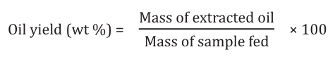The extracts were kept in airtight bottles and stored in 4⁰C for further analysis. The percentage of oil yield was calculated using equation below
