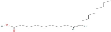 Oleic acid (C18H34O2) is a monounsaturated omega-9 fatty acid recognized as cis-9-octadecenoic acid. Oleic acid has many beneficial effects on human health. One of the main dietary sources of oleic acid is olive oil. Numerous epidemiological, clinical and experimental research have shown that consumption of Mediterranean diet rich in olive oil has a profound influence on several health outcomes, including obesity, metabolic syndrome, cardiovascular disease and diabetes mellitus [20]. The GC- MS analysis of C. apetalum shows 32.06% oleic acid. It is very close to the amount present in peanut oil. In which it is 36–67% [21]. Oleic acid concentration is high among the five compounds extracted. The retention time is 19.408 S. Besides the favourable effects of oleic acid intake in adults, it is also essential in infants and children nutrition. Oleic acid is a component of tissues and membranes and a major fatty acid (FA) component of brain myelin phospholipid, which is mainly formed during the two years after birth [22]. Since oleic acid is rapidly deposited during myelination, its proportion in brain total lipids increases with progressive central nervous system myelination [23]. Thus, intake of oleic acid is of a great importance in post-natal life. Oleic acid C18: 1 (39.1–50%) is the dominating fatty acid in Calophyllum calaba [24].