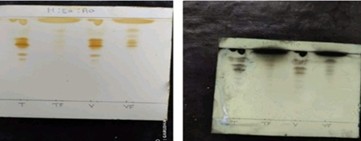 - The plates are visualized in UV chamber, iodine chamber, sprayed with 10% sulphuric acid and phosphomolybdic acid reagents and then heated at 105⁰C. The colour of the spots developed was noted.