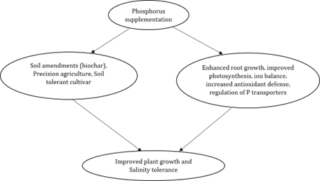 Salinity stress is a major environmental factor that limits agricultural productivity, especially in arid and semi-arid regions. Phosphorus (P), an essential macronutrient, plays a crucial role in enhancing plant tolerance to salinity by supporting root growth, energy metabolism, membrane stability, and maintaining ionic balance. Adequate P nutrition enables plants to sustain better physiological functions, reduce ion toxicity effects, and improve overall growth and yield in saline conditions. Effective management combining P fertilization with salt-tolerant crop cultivars and optimized agronomic practices is a practical strategy to maintain crop productivity in salt-affected soils. Looking ahead, precision agriculture advancements can optimize P fertilizer timing, form, and dosage to improve nutrient use efficiency in salt-stressed crops. Breeding and biotechnological tools such as gene editing can develop varieties with superior P-use efficiency and salt tolerance by targeting genes involved in P uptake and signalling pathways. Innovations in slow-release nano-P fertilizers and phosphate-solubilizing microorganisms offer eco-friendly solutions to enhance P availability in saline soils. Manipulating root architecture and beneficial microbes in the rhizosphere can improve P acquisition and mitigate salt-induced nutrient imbalances. Integrative physiological, biochemical, and omics-based approaches can deepen understanding of P–salinity interactions and aid early stress detection and optimization. Long-term field trials across diverse climates are essential to validate lab findings and develop region-specific recommendations for salt-affected agriculture.